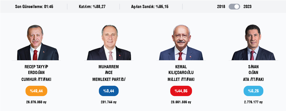 Yaklaşık 56 milyon vatandaşın her birine teşekkür eden Cumhurbaşkanı Erdoğan, şimdiden en yakın rakibimize 2 milyon 600 bin civarında fark attık. Kesin sonuçların açıklanmasıyla bu farkın daha da artacağını biliyoruz. Biz yüzde 50'nin üzerinde bir oy oranıyla bu turu bitireceğimize inanıyorum. Zira yurtdışı oylar tamamiyle ülkemize intikal etmiş değil, bunun sayımları devam ediyor. Seçim zaferinin gölgelenmesine yol açacak en küçük bir zaafiyete izin vermeden süreci takip edeceğiz. TBMM üyeliği seçimleri mevcut tabloyla bile Cumhur İttifakı'nın çoğunluğu kazanmasıyla neticelenmiştir. Şu anda parlamentoda çoğunluk Cumhur İttifakı'ndadır. Komisyonların genelinde Cumhur İttifakı hakimdir. Dolayısıyla mecliste çoğunluğunun Cumhur İttifakı'na veren vatandaşların Cumhurbaşkanlığı seçimlerinde de güven ve istikrardan yana olacağından şüphe duymuyorum" dedi.