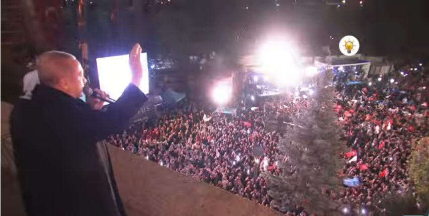 Ülkenin demokrasi şölenini alnının akıyla tamamladıklarını açıklayan henüz kesin sonuçlar belli olmamakta beraber, açık ara önde bulunduklarını kaydeden Cumhurbaşkanı Erdoğan, "Açık ara öndeyiz" diyerek, "Birileri mutfakta, biz balkonda" yorumunda bulundu.
