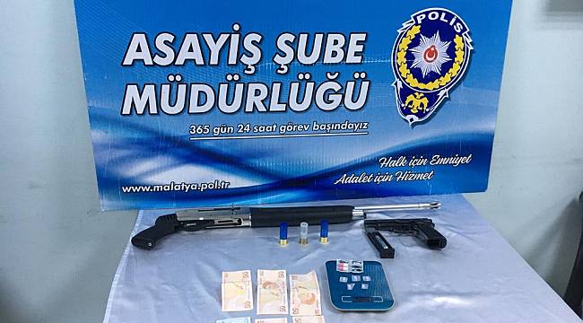B.D. isimli şahsın yapılan üst aramasında 5 adet uyuşturucu ve uyarıcı hap,hassas terazi, 1 adet gaz tabancası ele geçirilmiş, daha sonra şahısın aracı kontroledildiğinde içerisinde 1 adet pompalı tüfek ve tüfeğe basılı vaziyette 3 adetdolu kartuş ele geçirilmiş,